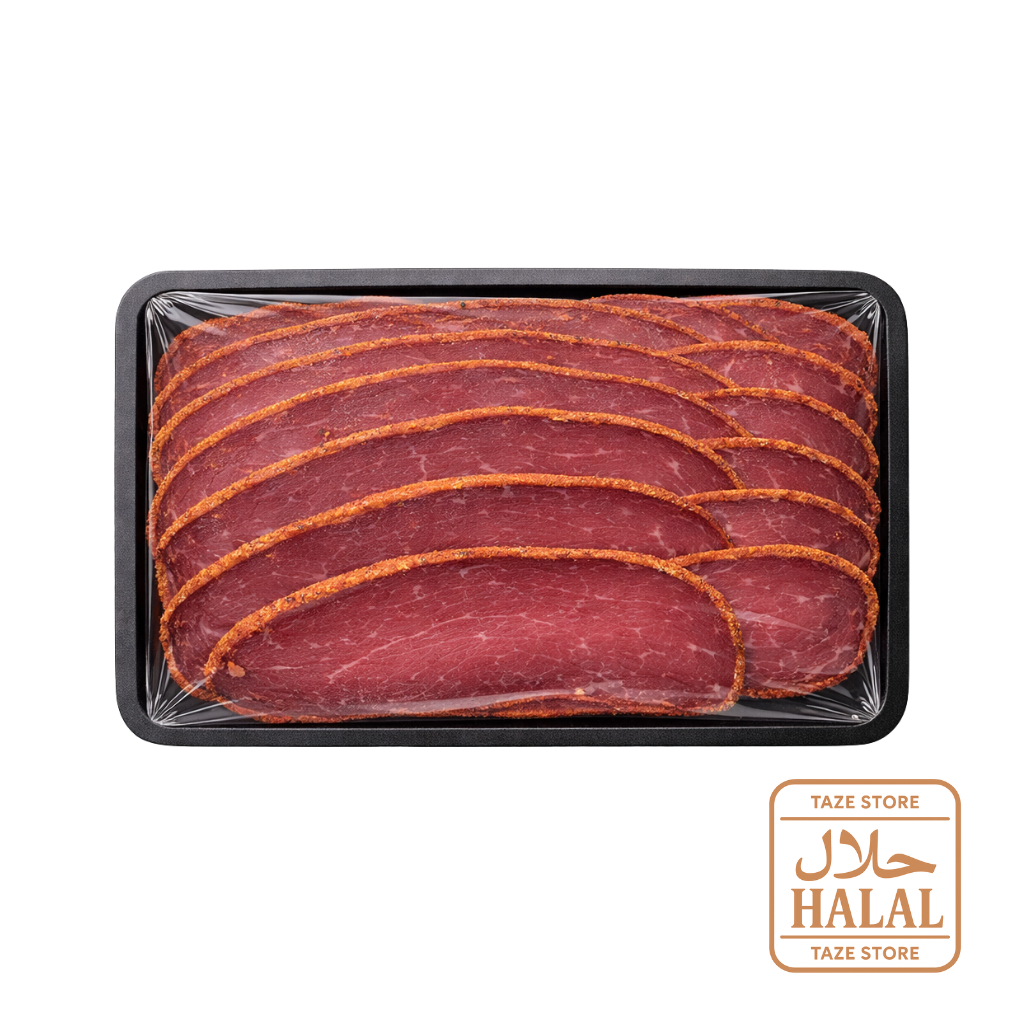 Unser Halal-Rinderpastirma in Berlin wird aus hochwertigem, Halal-zertifiziertem Rindfleisch hergestellt, sorgfältig gewürzt und nach traditionellen Methoden luftgetrocknet, um sein unverwechselbares Aroma, seinen vollen Geschmack und seine zarte Textur zu erzielen. Pastirma ist bekannt für seinen intensiven Geschmack und sein einzigartiges Gewürzprofil und gilt als Premium-Rinderfleischprodukt, das in der nahöstlichen und mediterranen Küche sehr geschätzt wird.